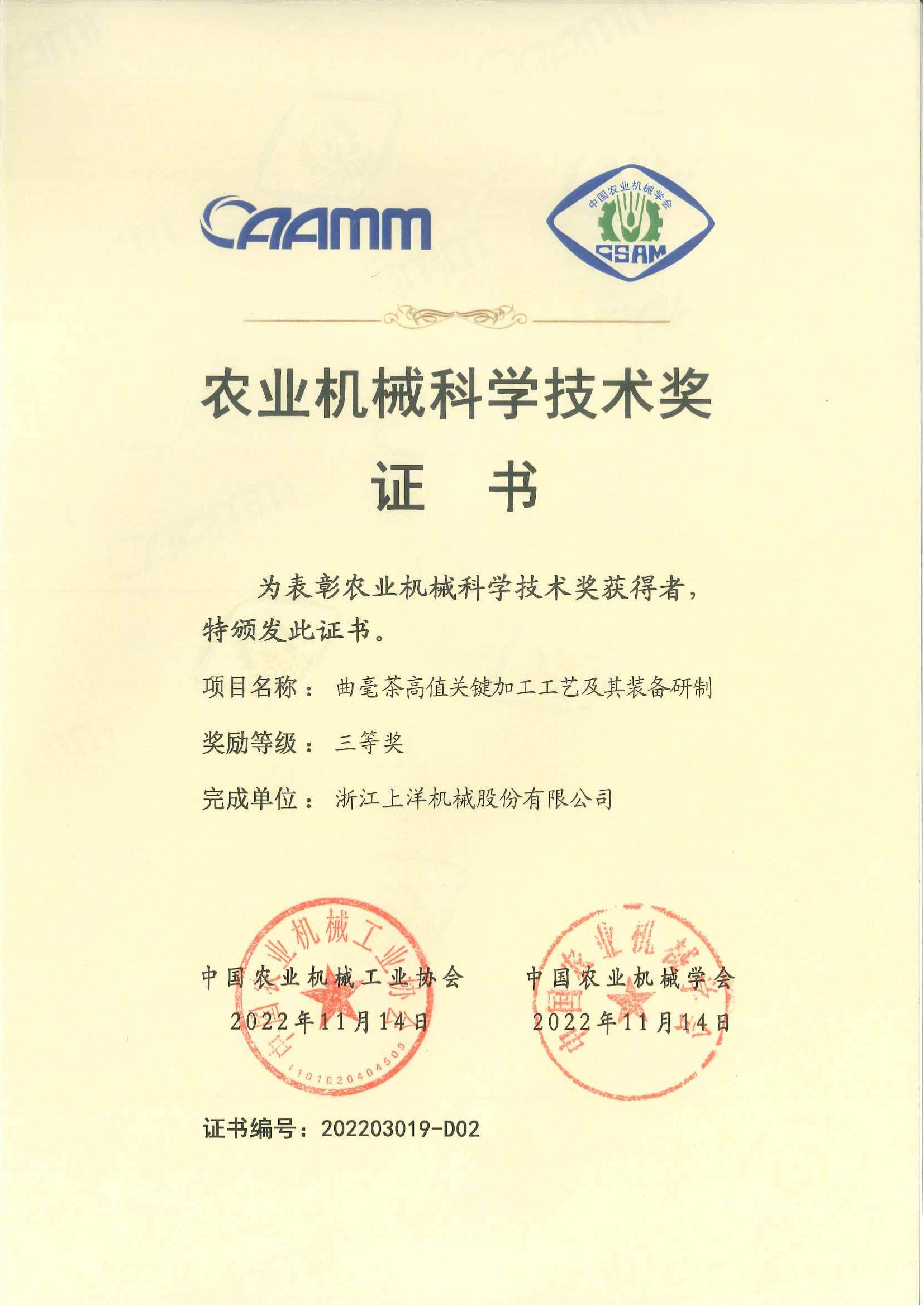 2023年浙江省農(nóng)業(yè)機(jī)械科學(xué)技術(shù)獎(jiǎng)二等獎(jiǎng)