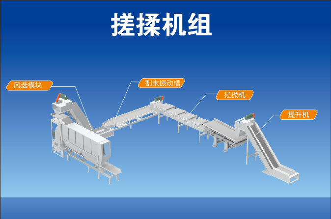機(jī)組組成:本機(jī)組由提升機(jī)、搓揉機(jī)、割末振動槽、風(fēng)選機(jī)、機(jī)組集成控制系統(tǒng)組成。
